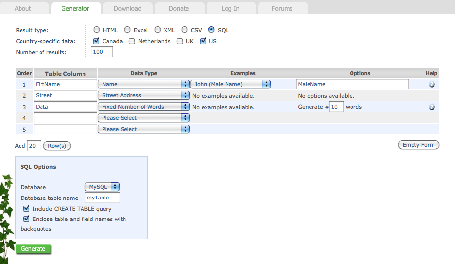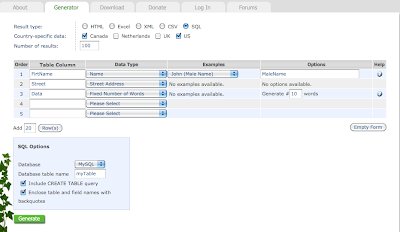 Estudando pela net achei um site muito útil para nós desenvolvedores de softwares, o GenerateData.com. Nele é possível gerar dados aleátorios em formato EXCEL (XLS(X)), XML, CSV, HTML e o melhor de todos, SQL ( Inserts dos dados e CREATE TABLE).